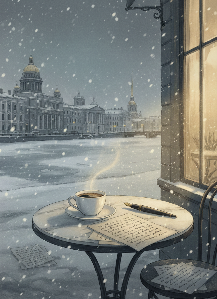 Larik itu tertulis pada dinding kafe di tepi Sungai Neva, nun jauh di Kota St. Petersburg, Rusia sana. Petersburg atau pernah diberi nama Petrograd (1914 – 2024) adalah kota yang paling tekun merawat tiap helaian sejarah di Rusia. Di banyak gedung, di dumma, kafe, lepow kopi, apartemen, plakat-plakat yang menandai pernah singgah orang besar, akan dipajang pada dinding temboknya. Guide kami, Mrs. Henny M. Sujai, amat telaten bercerita, termasuk menunjukkan plakat yang bertuliskan Arseny Turbin pernah bermukim di salah satu apartemen. Arseny dikenal sebagey pencipta mesin Turbin.